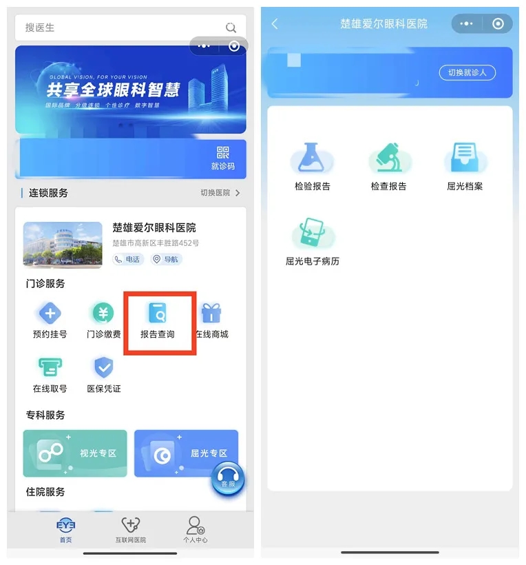 功能解析:掃碼關(guān)注“楚雄愛爾眼科”公眾號,點(diǎn)擊底部“預(yù)約掛號”進(jìn)入微信預(yù)約掛號頁面。